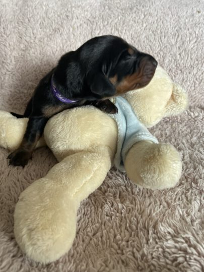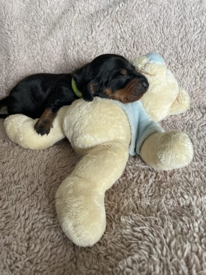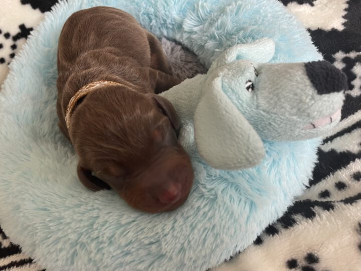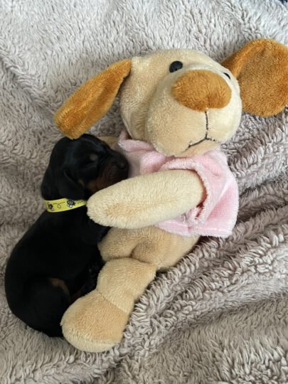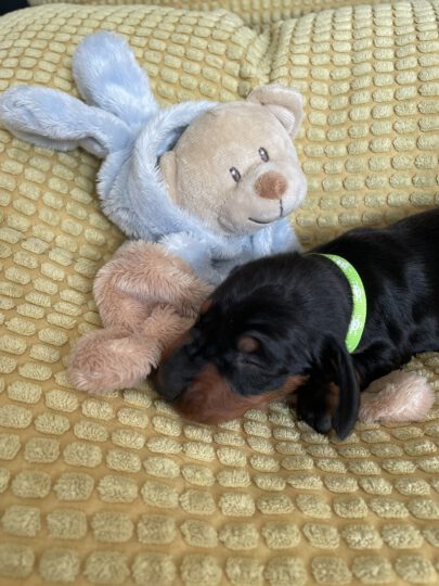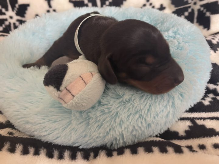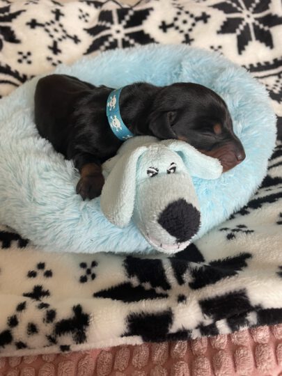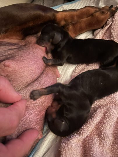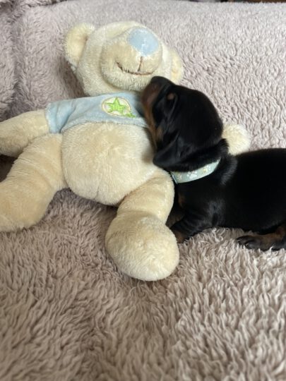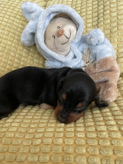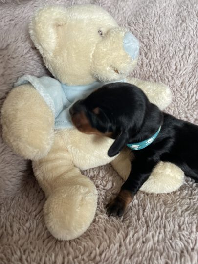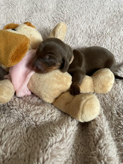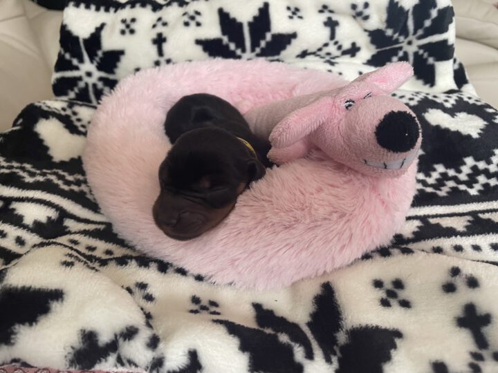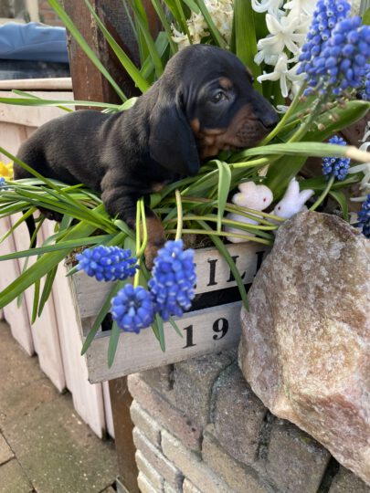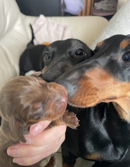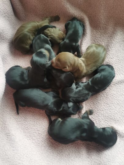 Hier de eerste foto’s van de puppy’s van onze knappe Bl & Tn reu Tomland Teckel Remy PUZZLE voor de insiders; en de eerste uitverkoren Choc & Tn dame is onze Jump For Joy From Black Palace, beter bekend als NOOR (tje) !!